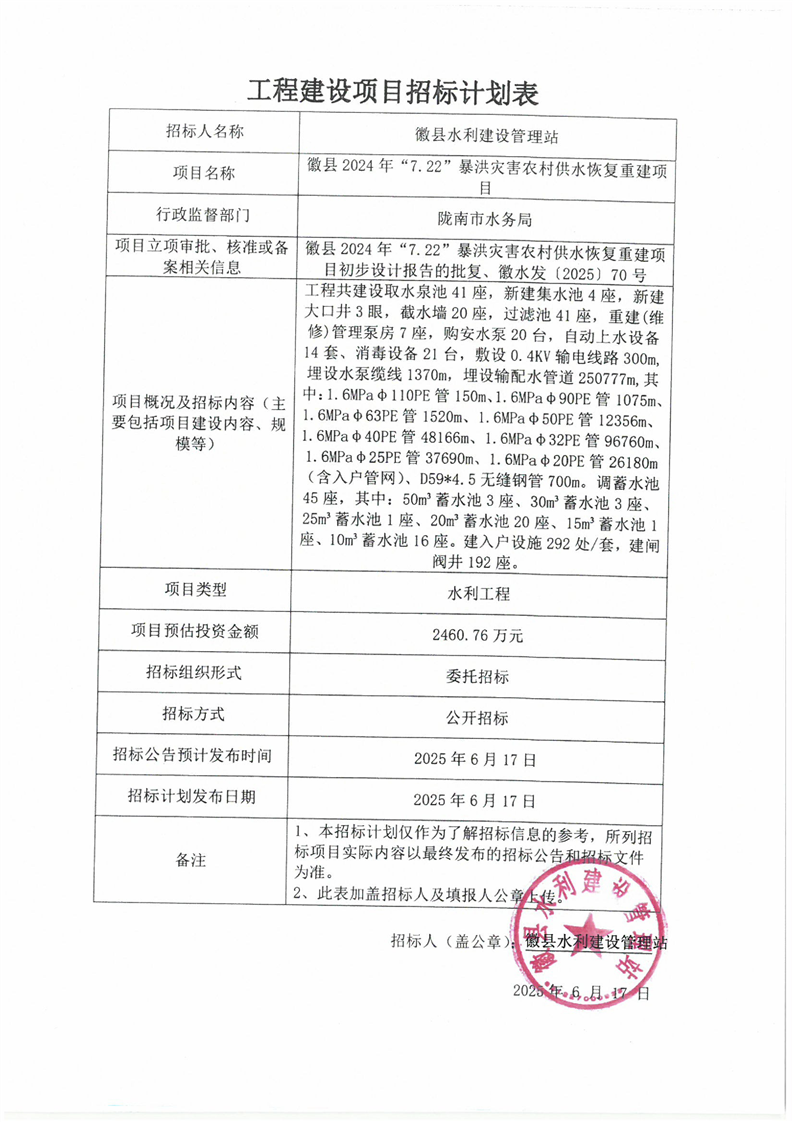 徽縣2024年“7.22”暴洪災(zāi)害農(nóng)村供水恢復(fù)重建項目