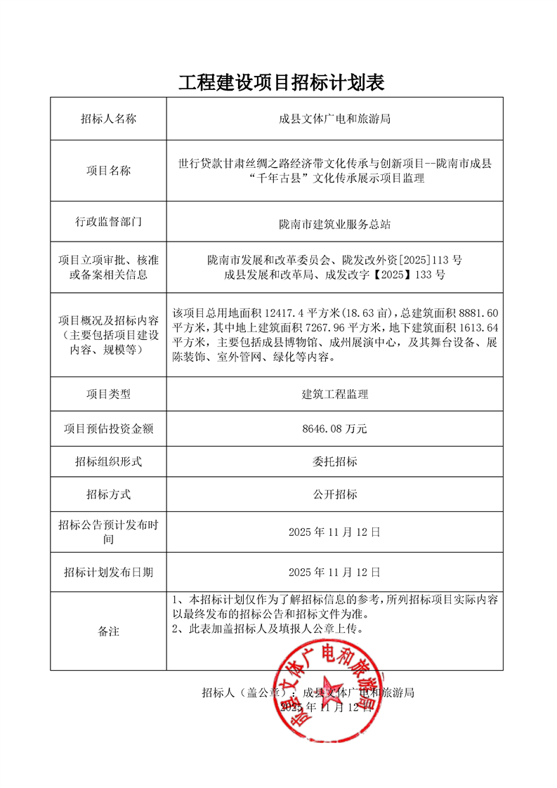 附件:工程建設(shè)項目招標計劃表世行貸款甘肅絲綢之路經(jīng)濟帶文化傳承與創(chuàng)新項目--隴南市成縣“千年古縣”文化傳承展示項目監(jiān)理.pdf