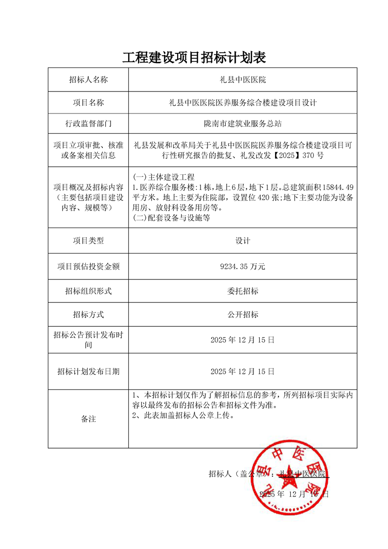 禮縣中醫(yī)醫(yī)院醫(yī)養(yǎng)服務(wù)綜合樓建設(shè)項(xiàng)目設(shè)計